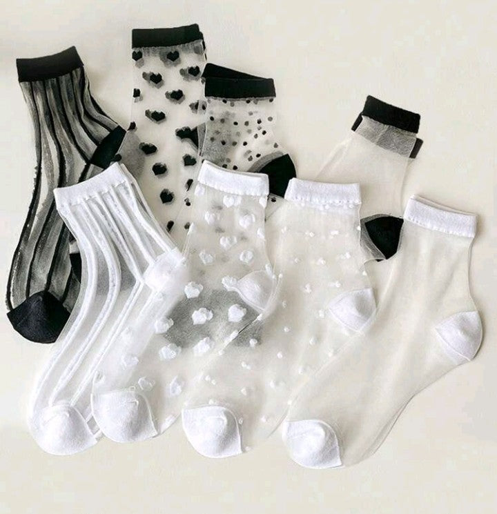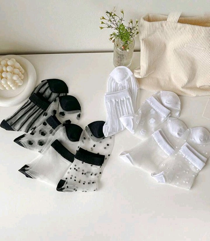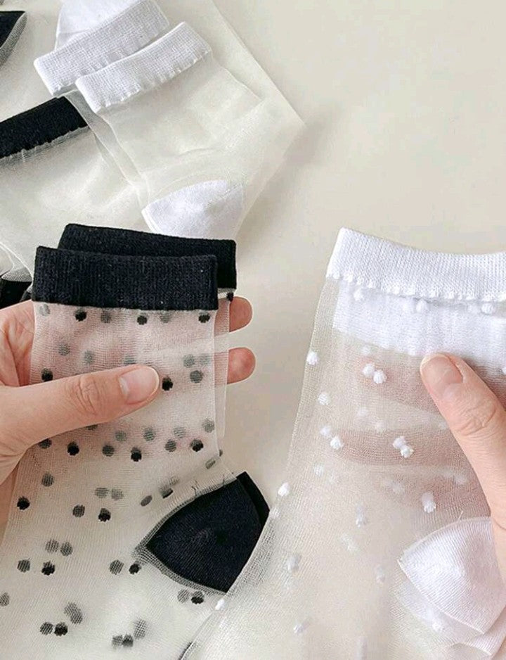 Par de medias hasta el tobillo de malla en blanco y negro. Estilo casual, delgadas. Ideal para usar con botas
